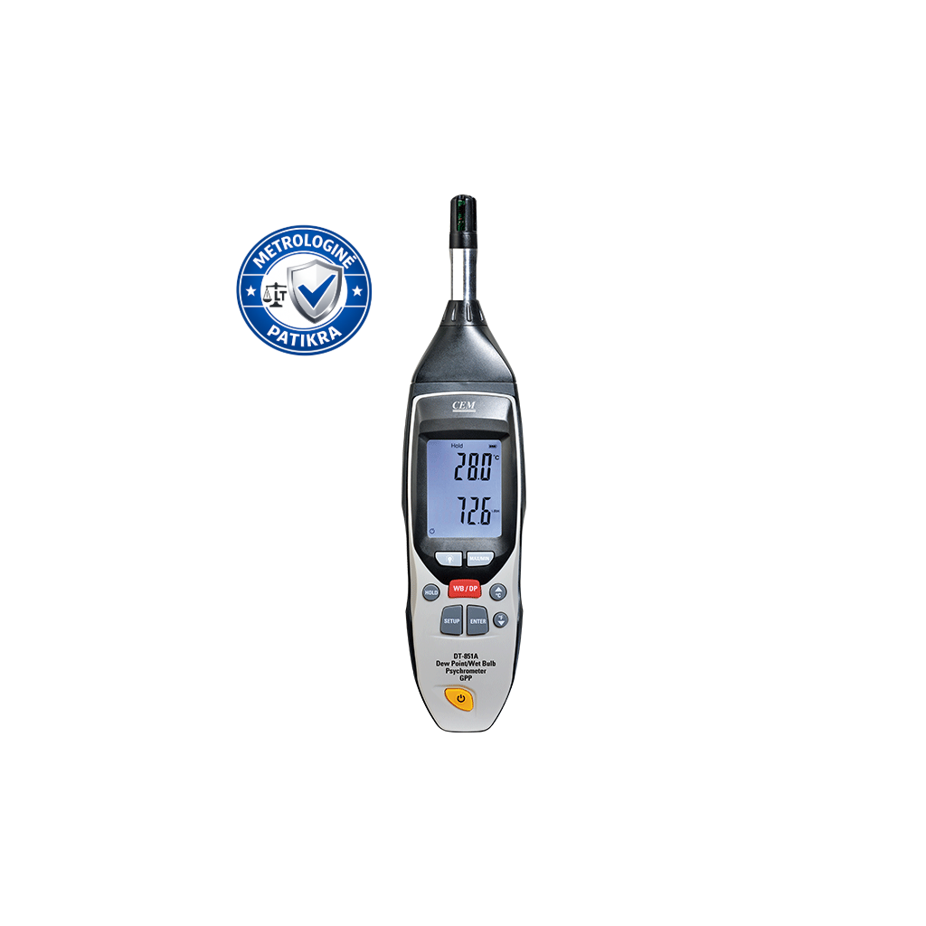 CEM DT-851 su metrologine patikra – tai patikimas skaitmeninis temperatūros ir santykinės oro dregmės matuoklis, pateikiamas su atlikta metrologine patikra ir galiojanciu patikros dokumentu.