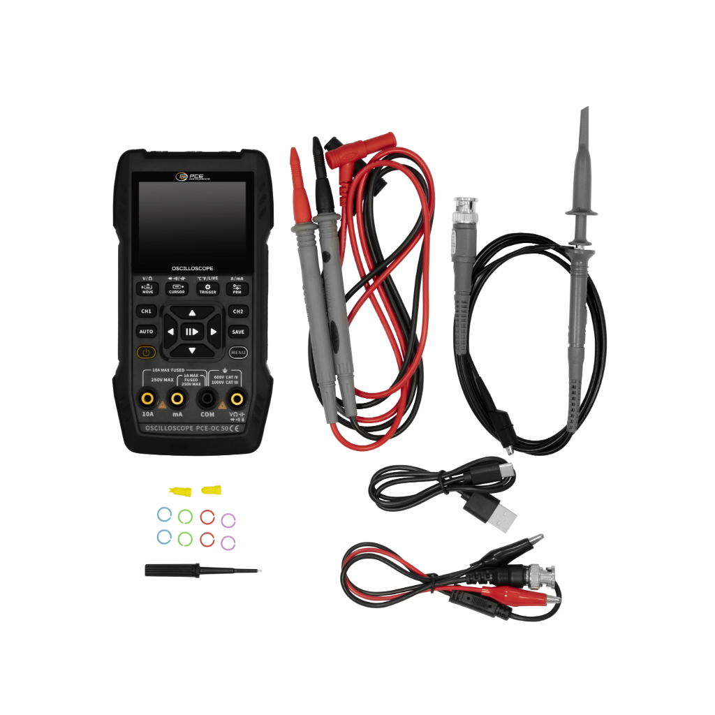 Skaitmeninis multimetras su multimetru ir signalo generatoriumi / 2 kanalų / 10 MHz pralaidumas / nuolatinė ir kintamoji įtampa / nuolatinė ir kintamoji srovė / su zondu ir bandymo laidais / USB-C / maitinimas su įkraunama baterija