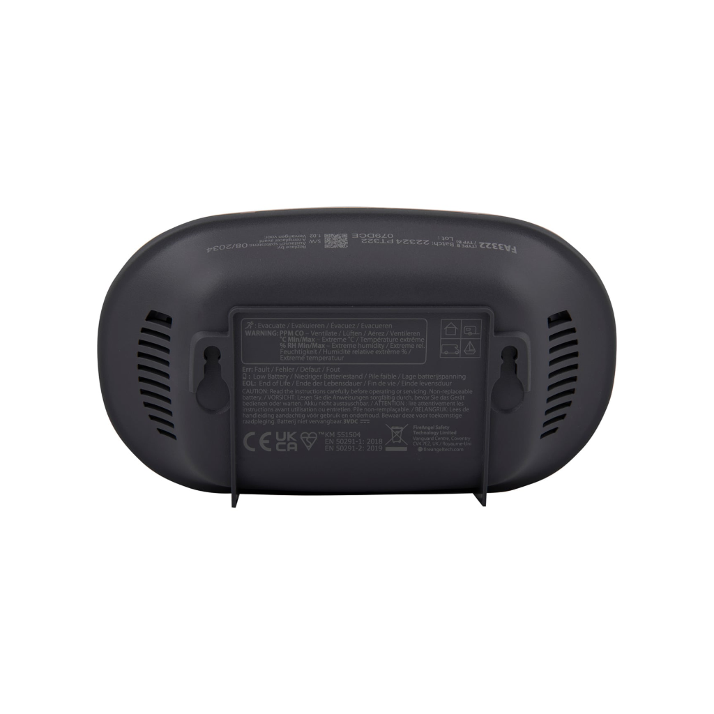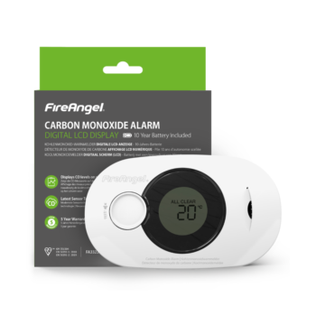 Anglies monoksido detektorius su skaitmeniniu ekranu FireAngel FA3322-INT turi 10 metų tarnaujančią sandarią ličio bateriją ir gali būti montuojamas ant sienos arba pastatomas ant lygaus paviršiaus – ten, kur labiausiai reikalinga apsauga. „Sleep Easy™“ nutildymo ir automatinio naktinio jutimo funkcijos užtikrina, kad žemo baterijos lygio įspėjimai netrikdytų miego, kol prietaisas vis dar veikia saugiai.