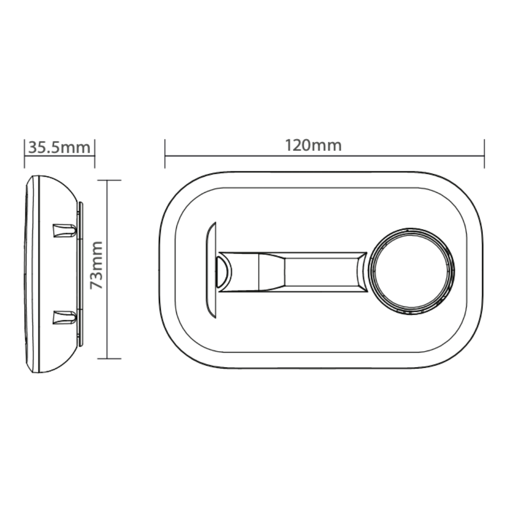 - Matmenys 120 mm (plotis) x 73 mm (aukštis) x 35,5 mm (gylis)