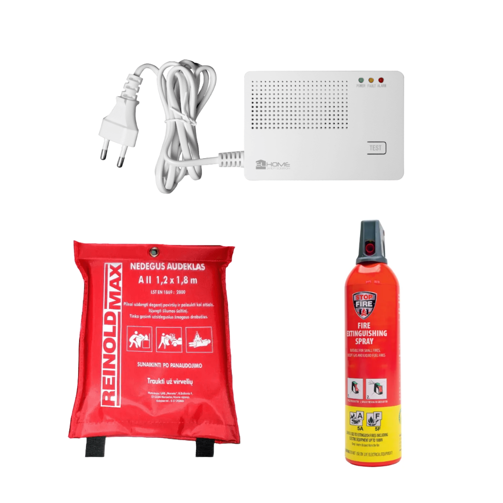 Pradinis | Parduotuvė | Priešgaisrinės priemonės | Rinkiniai | Dujų detektoriaus, gesintuvo ir nedegaus audeklo rinkinys EUR-19
