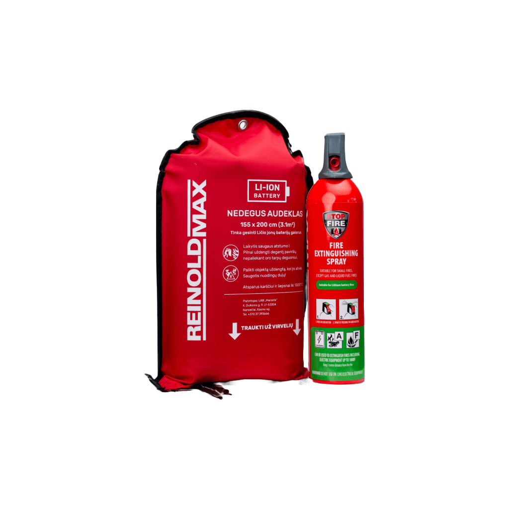 Rinkinys ličio jonų baterijų gaisrams gesinti ReinoldMax: audeklas (1,55*2m) + aerozolinė gesinimo priemonė. Audeklas yra atsparus karščiui ir liepsnai iki 1300˚C, t.y. temperatūrai iki kurios įkaista deganti ličio-jonų baterija. Audeklas yra skirtas uždengti degančią ličio-jonų baterją.