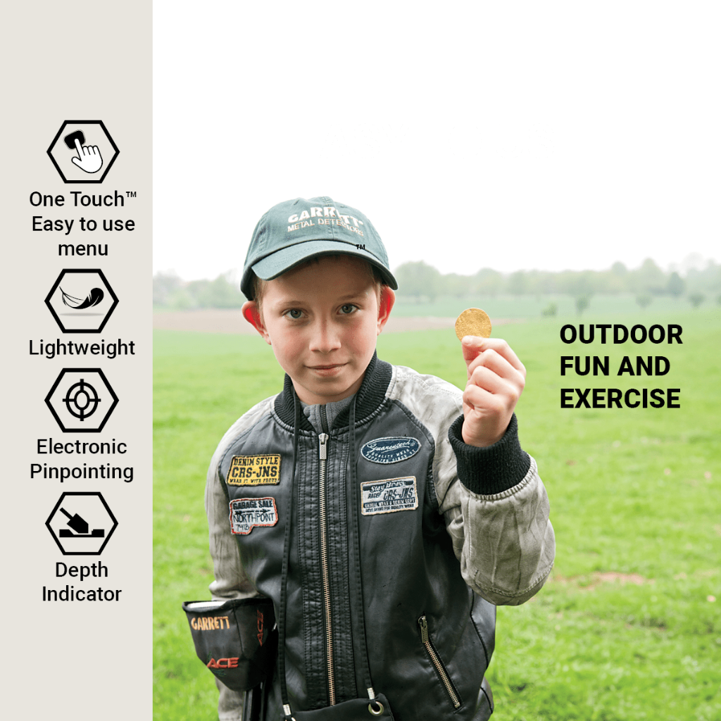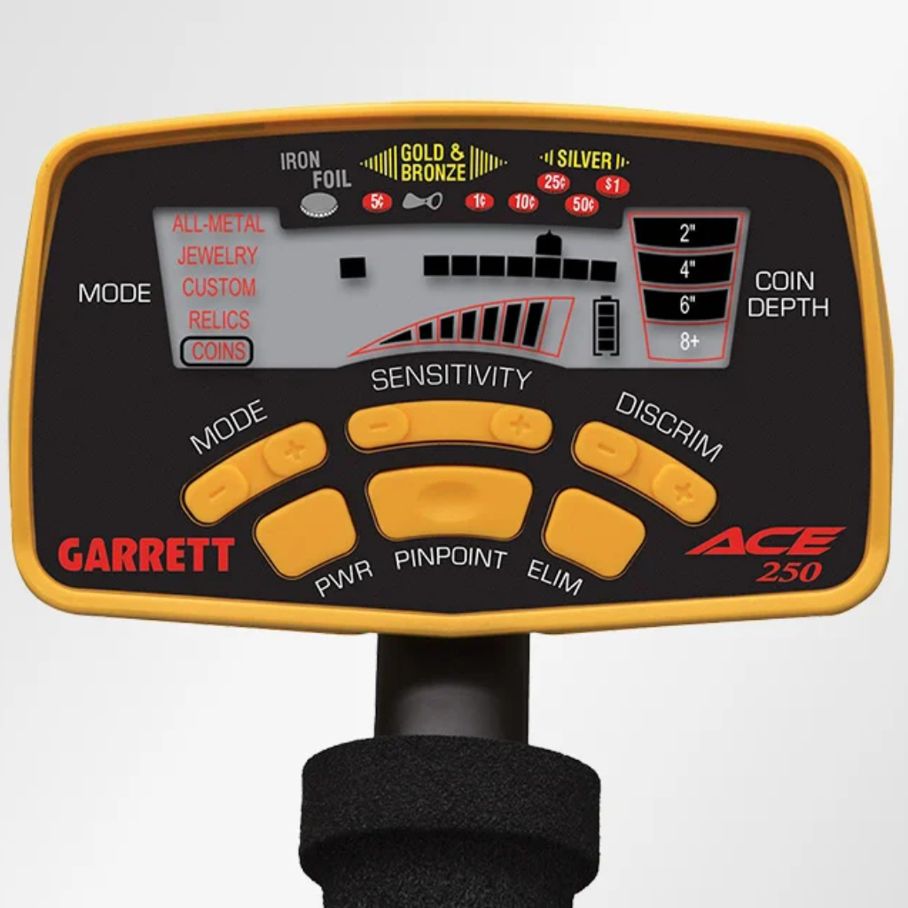 Garrett ACE 250 taip pat turi pinpoint funkciją, kuri padeda tiksliai nustatyti radinio vietą, taip sumažinant nereikalingų kasimų skaičių. Lengvas ergonomiškas dizainas ir vandeniui atspari 6,5″ × 9″ PROformance ritė leidžia patogiai naudoti detektorių tiek viešose vietose, tiek gamtoje ar prie vandens.