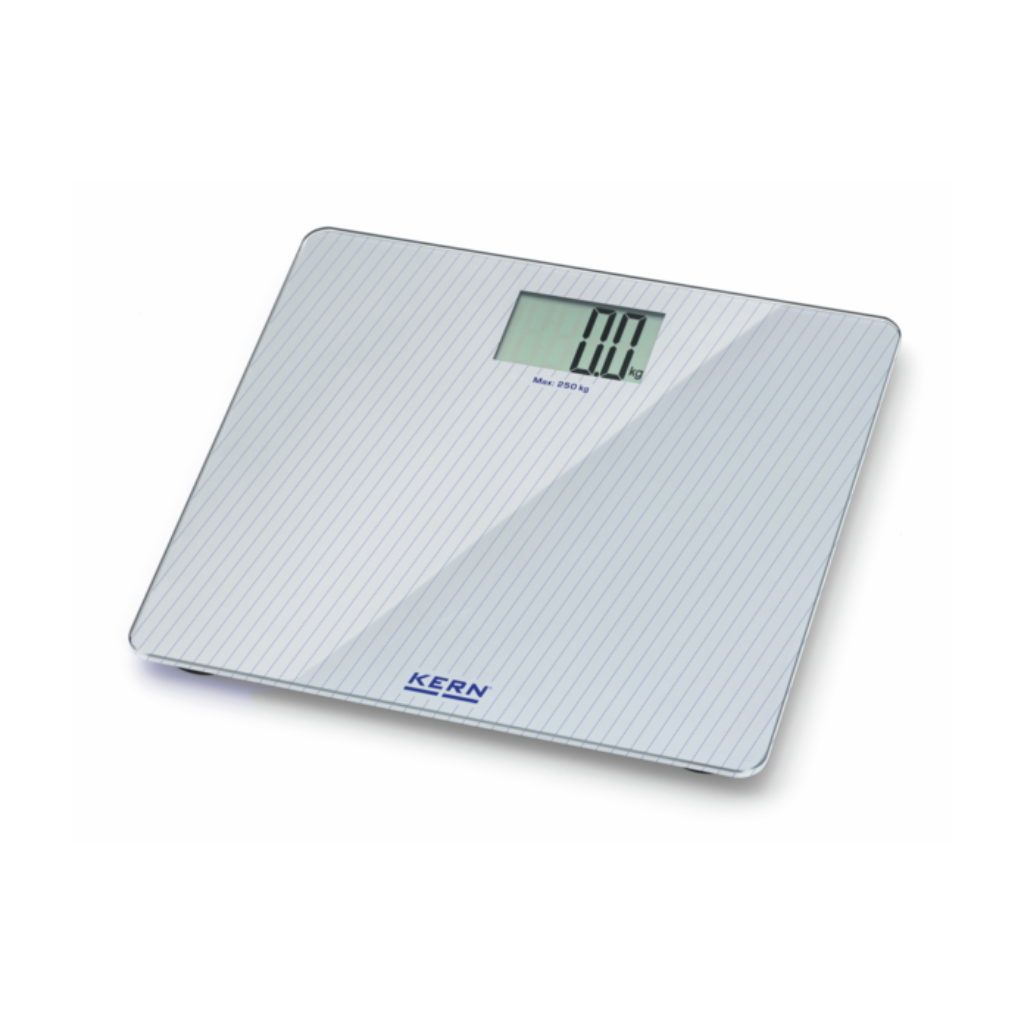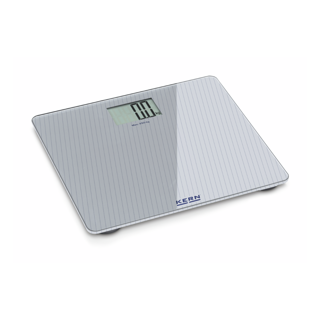 Asmeninės svarstyklės KERN MGD 200K-1L – elegantiška išvaizda ir didelė plokščia stiklinė svėrimo plokštelė, palengvinanti užlipimą ir užtikrinanti maksimalų saugumą.