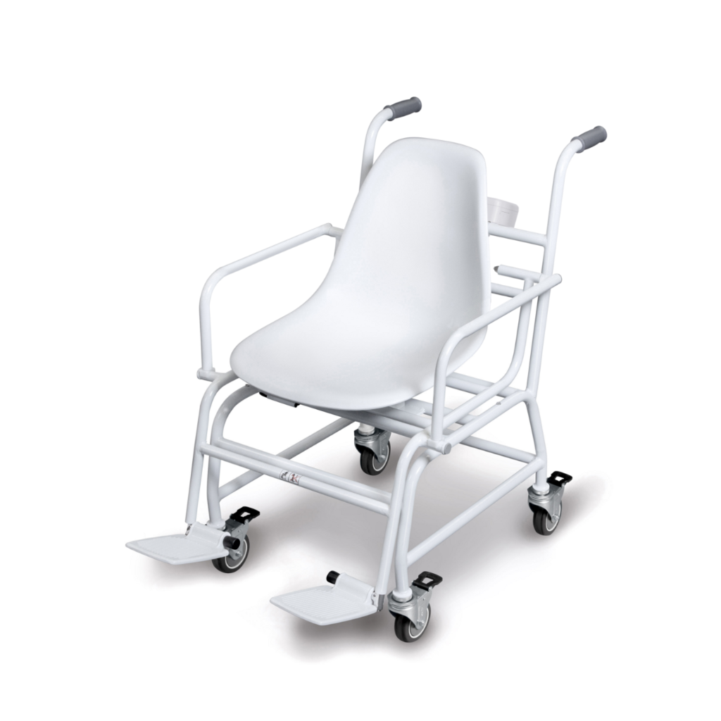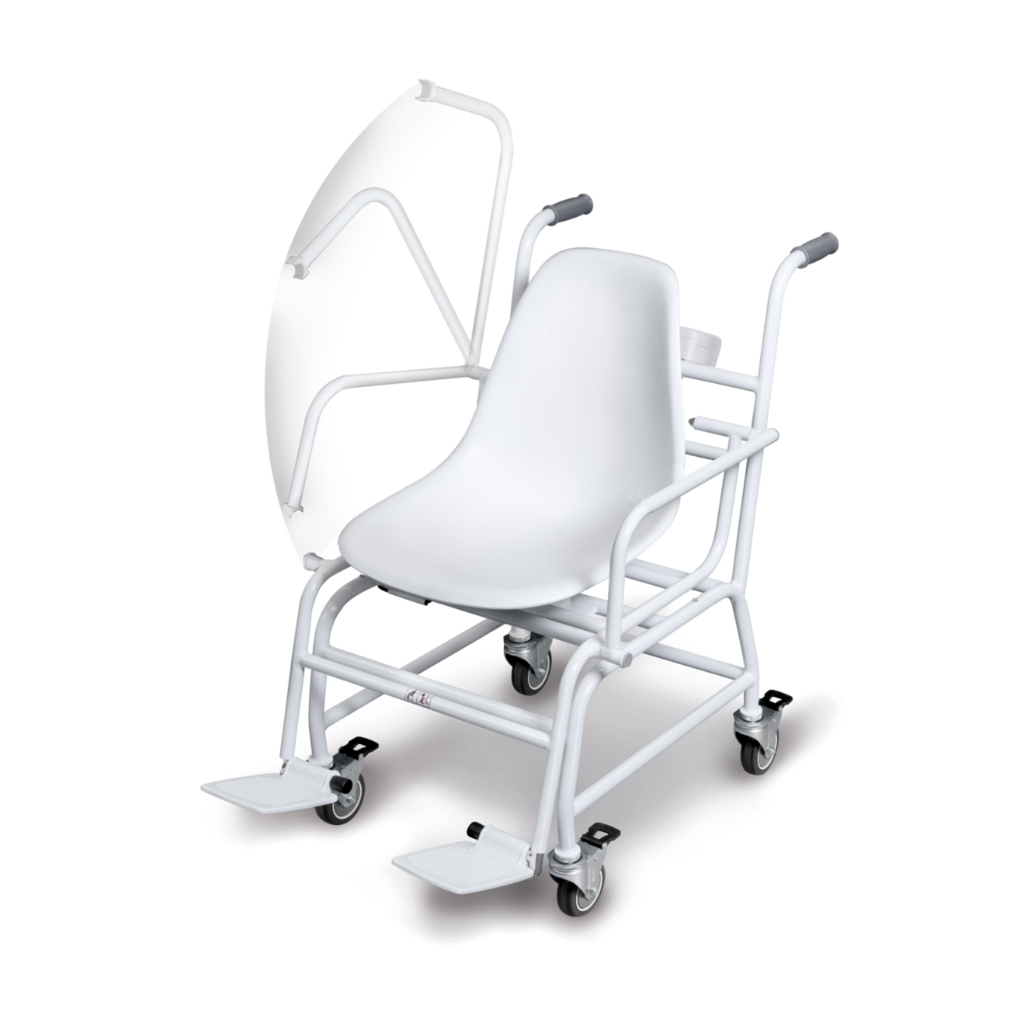 Kėdės tipo svarstyklės leidžia saugiai sverti pacientą sėdint, nereikalaujant stovėti ar persikelti.