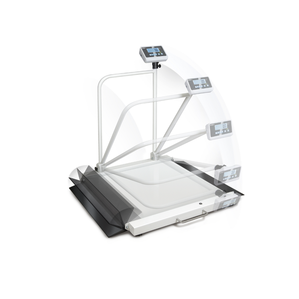 - Vežimėlio platformos svarstyklės su praktišku turėklu, įskaitant koloną, skirtą lengvai ir ergonomiškai pritvirtinti ekrano įrenginį. Turėklas suteikia pacientams papildomą saugumą važiuojant ar lipant ant svėrimo platformos.