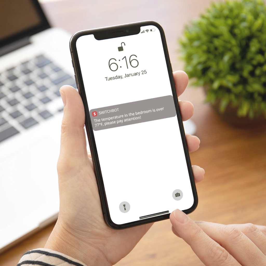 - Galimybė integruoti su „SwitchBot Hub“ nuotoliniam stebėjimui