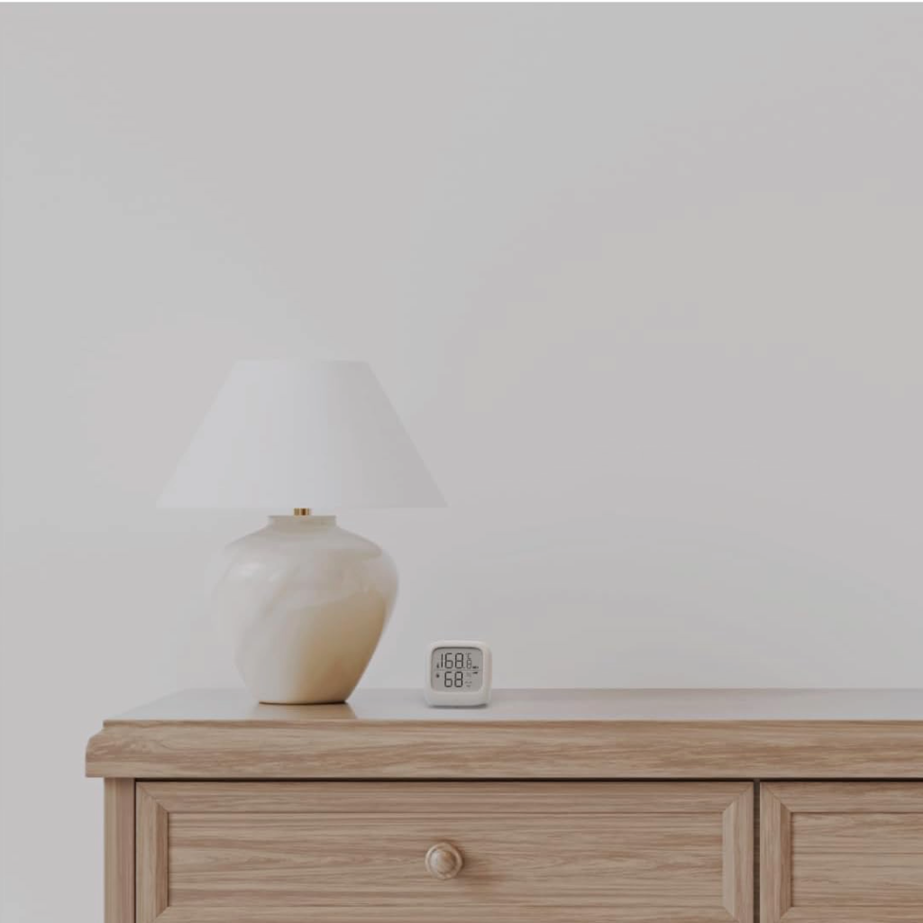 - Aiškus LCD ekranas rodo temperatūrą, drėgmę, baterijos būseną ir šypsenėlės piktogramą, kad vienu žvilgsniu galėtumėte įvertinti komforto lygį